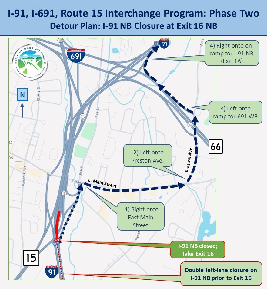 - When I-91 NB is closed at Exit 16, the detour route is as follows: