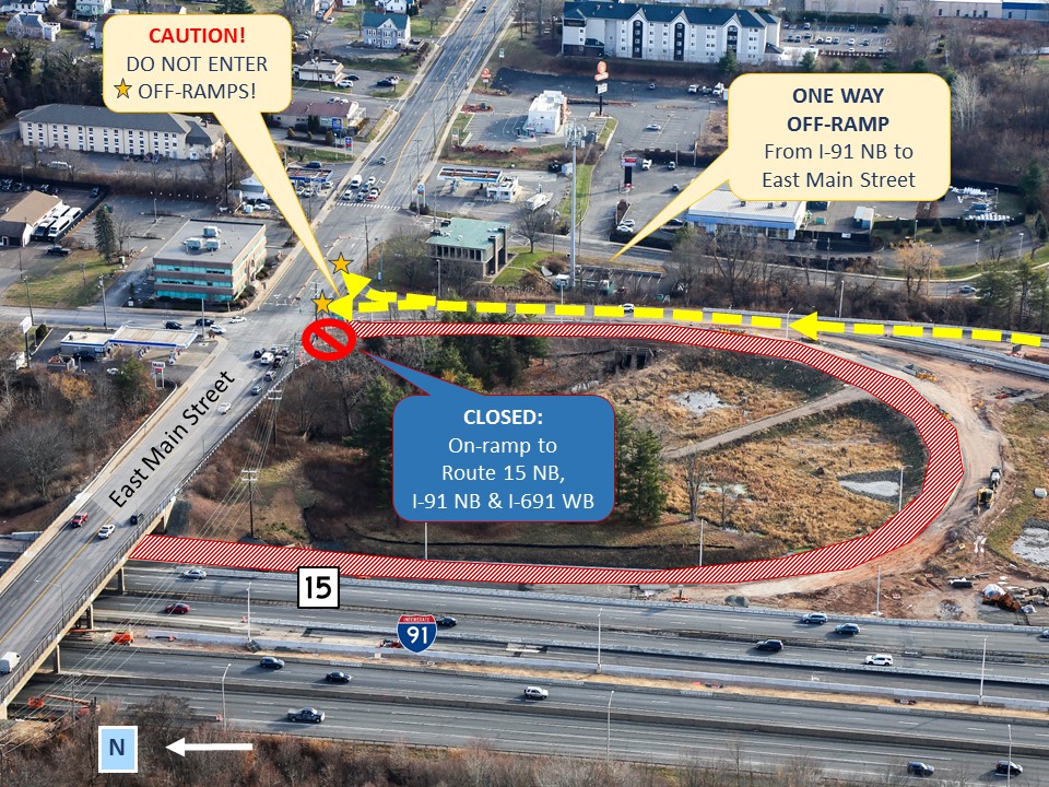 CAUTION: While the on-ramp to Route 15 NB, I-91 NB, and I-691 WB from East Main Street is temporarily closed, be sure to use the correct detour route to access these roadways.